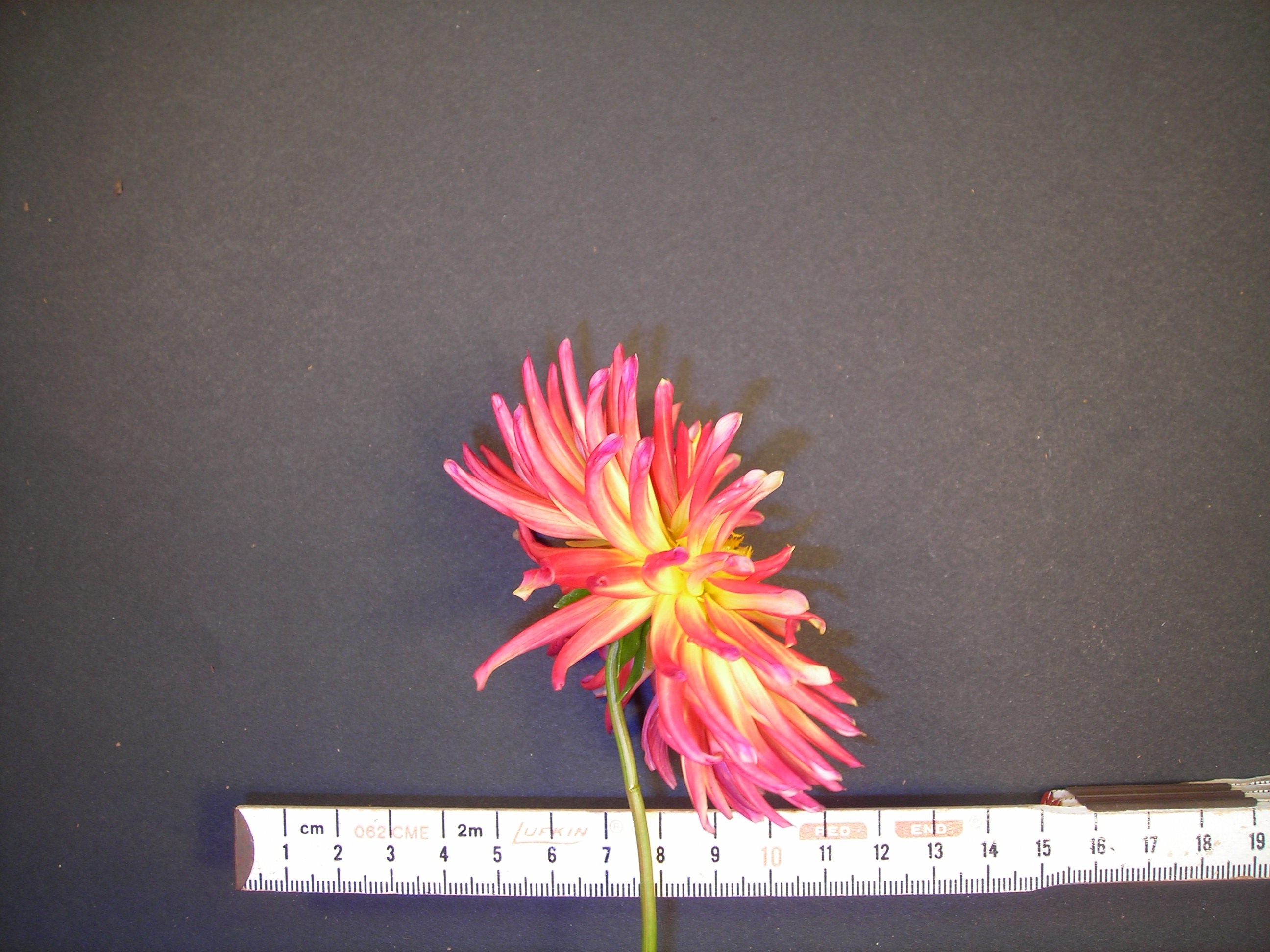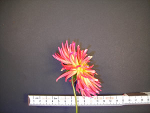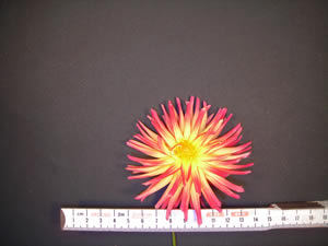 This cultivar is cactus type, flame blend in color and of size M. It was registered in 2000 by T.E. McClelland, Bulkington, Warks, England.