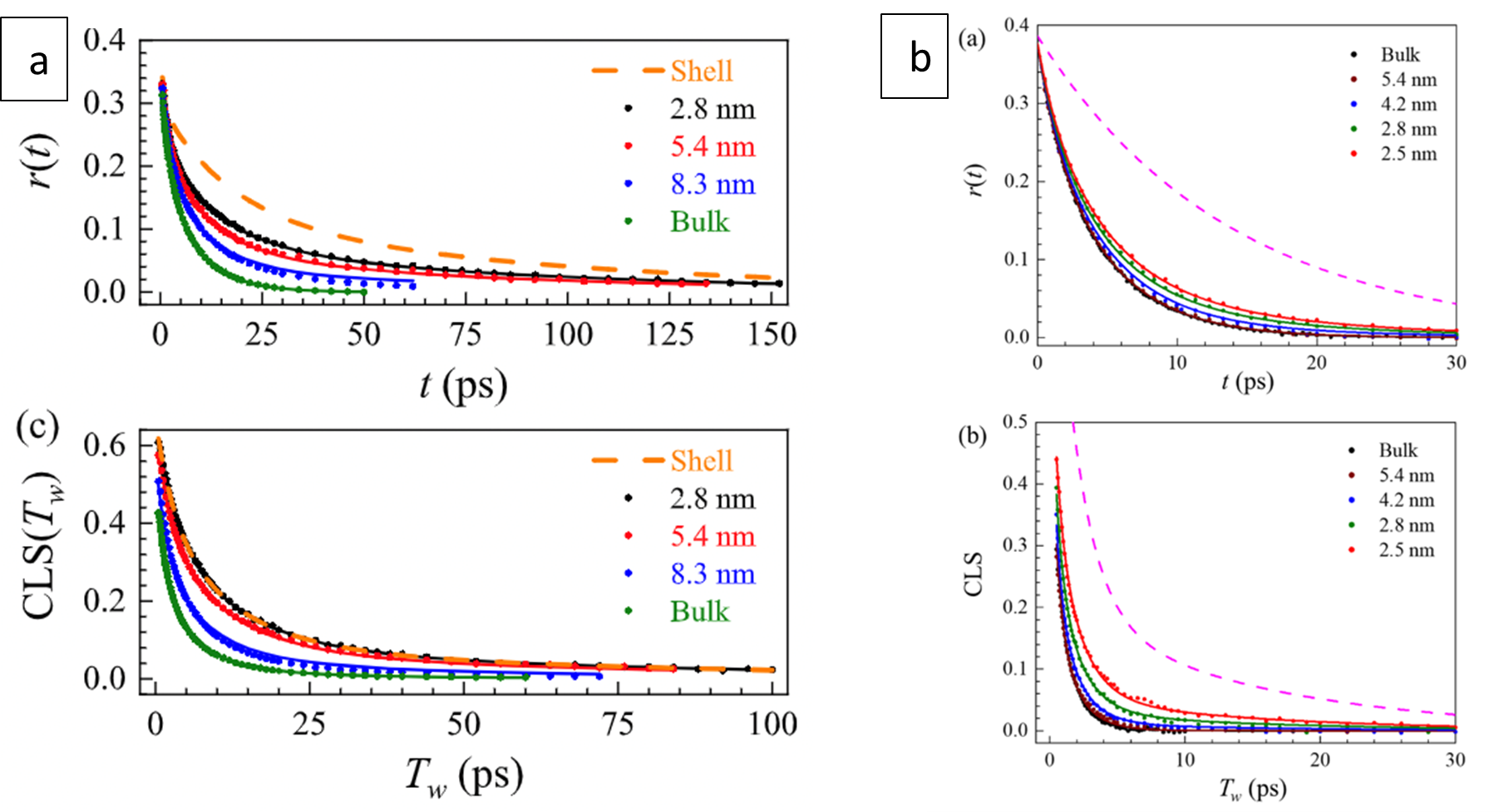 Figure 4. anisotropies and CLS decays of SeCN- in (a) MeIm and (b) D2O in bulk and confined in silica pores of various sizes. The solid curves are modified two-state model fits, which agree well with the experimental data. The dashed curves are the model shell dynamics that best fit the data from all pore sizes.