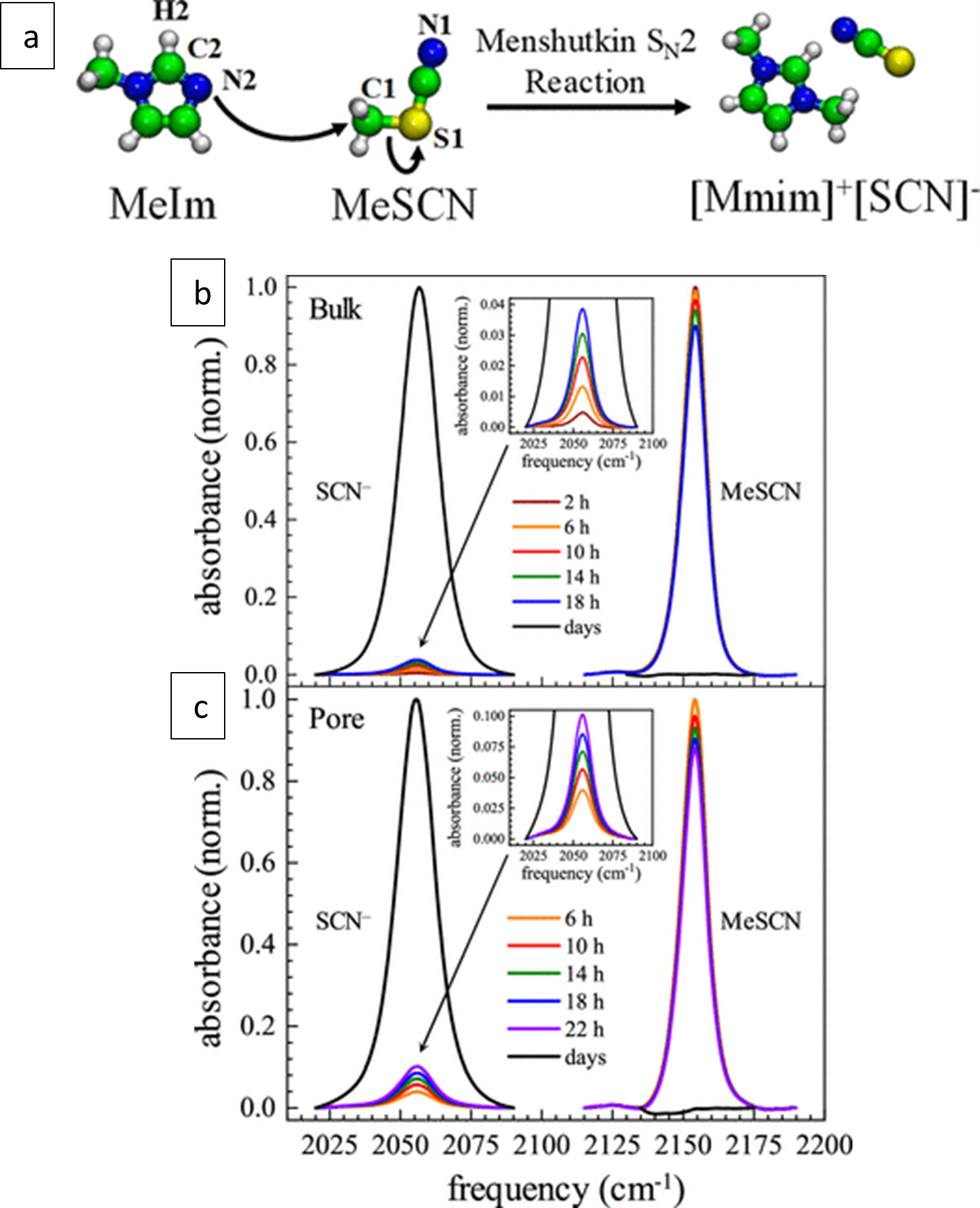 Figure 5. The rate of the Menshutkin SN2 reaction between 1-methylimidazole and methyl thiocyanate (a) accelerates significantly when the reactants are confined in 2.8 nm silica pores (c) compared to the bulk reaction (b) as detected by time-dependent FTIR spectroscopy.