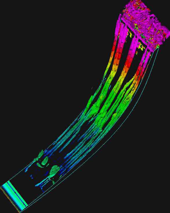 Negative Lambda_2 surfaces near blade pressure side: tb, color is velocity magnitude
