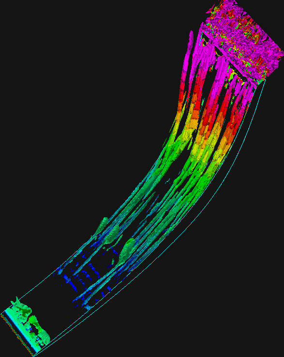 Negative Lambda_2 surfaces near blade pressure side: td, color is velocity magnitude
