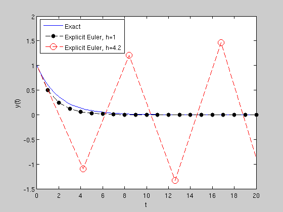 figure(1); clf; plot(t_true,y_true) hold on plot(t1,y1,'k.--','MarkerSize',20) plot(t2,y2,'ro--','MarkerSize',10) axis([0 20 -1.5 2]) xlabel('t') ylabel('y(t)') legend('Exact','Explicit Euler, h=1','Explicit Euler, h=4.2','Location','NorthWest')