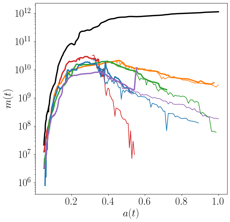 Now, we’ll try analysis that’s a bit more quantitative. We’ll look at the growth of subhalos over time: looking at the growth of the host halo and its five most massive subhalos over time. To do this, we’ll need to get the scale factors, \(a(z)\), for each snapshot with symlib.scale_factors(). We’ll also use one of the fields in histories, "merger_snap" which is the snapshot when the subhalo first fell into the host. We’ll use it to plot times before infall as dashed lines and times afterwards as solid lines.