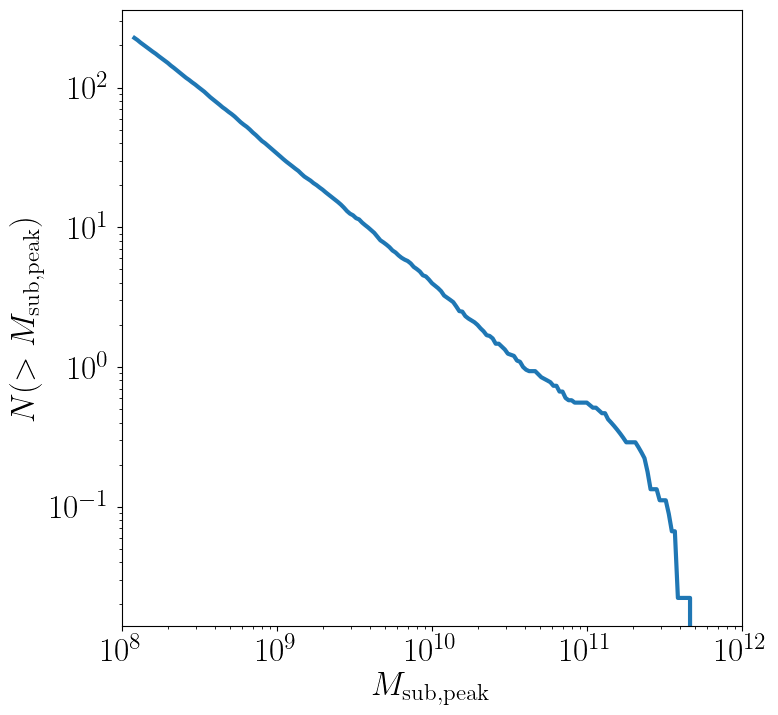 Lastly, let’s try some more rigorous statistical analysis. So far we’ve been looking at a population of subhalos surrounding one host halo. Now, we’re going to measure the subhalo mass function for all of the host halos in the Milky Way suite. The subhalo mass function is a statistic that counts the number of subhalos orbiting a host halo as a function of the subhalo’s mass. It is essentially a cumulative histogram of subhalo mass. We’ll need to look at \(N(>M_{\rm peak})\), the average number of subhalos per host halo whose maximum mass was larger than \(M_{\rm peak}\).