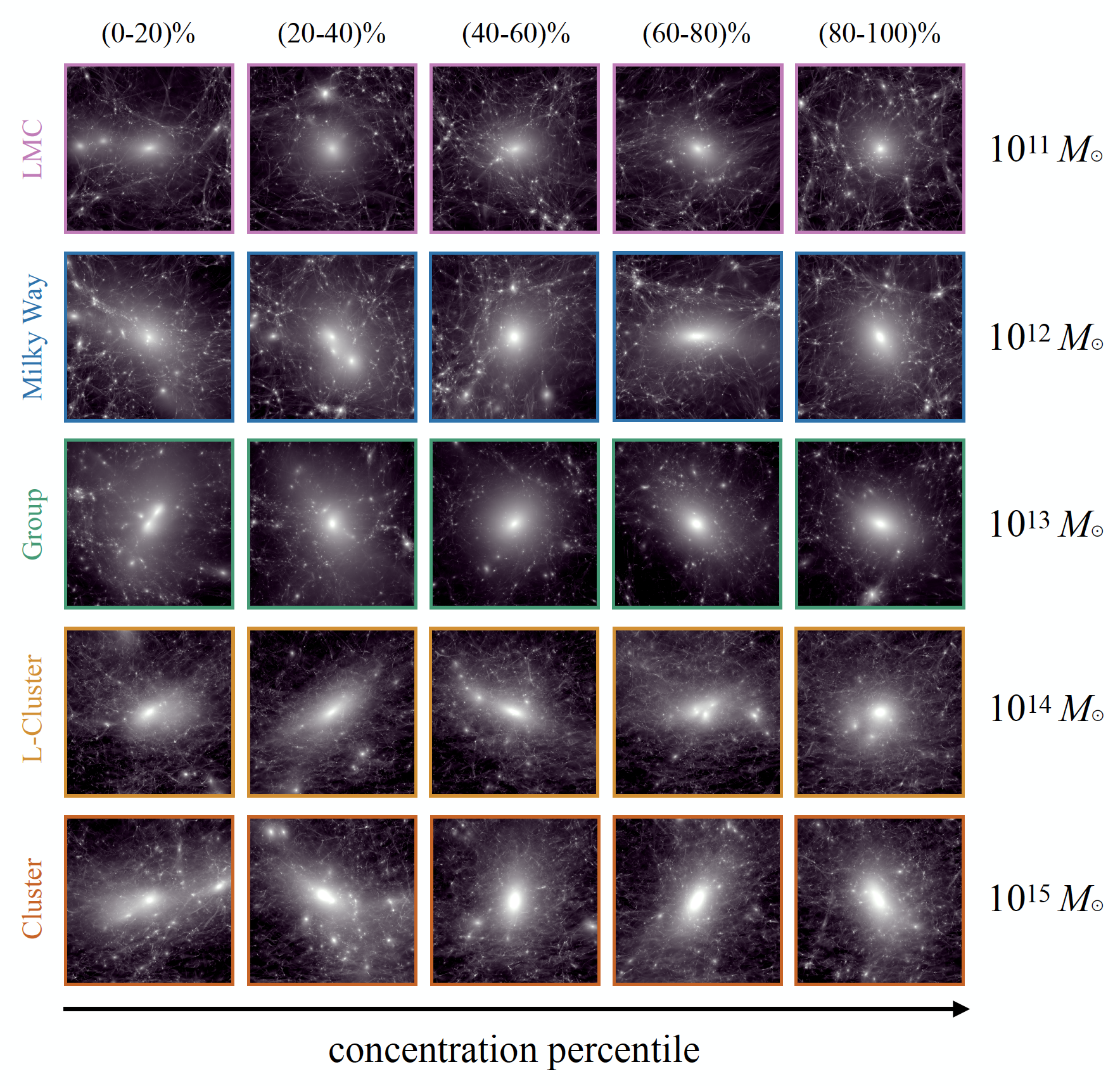 The image below shows five host halos from each Symphony suite. Each row corresponds to a different suite, from the lowest-mass (LMC) hosts at the top to the highest-mass (Cluster) hosts at the bottom. Host halo concentration—a number which increases as more of its mass is concentrated in the halo center—increases in quintiles from left to right, such that hosts with the more centrally concentrated dark matter distributions within each suite are shown towards the right. Visualizations were created using the phase-space tessellation method described in Kaehler et al 2017, 2018.