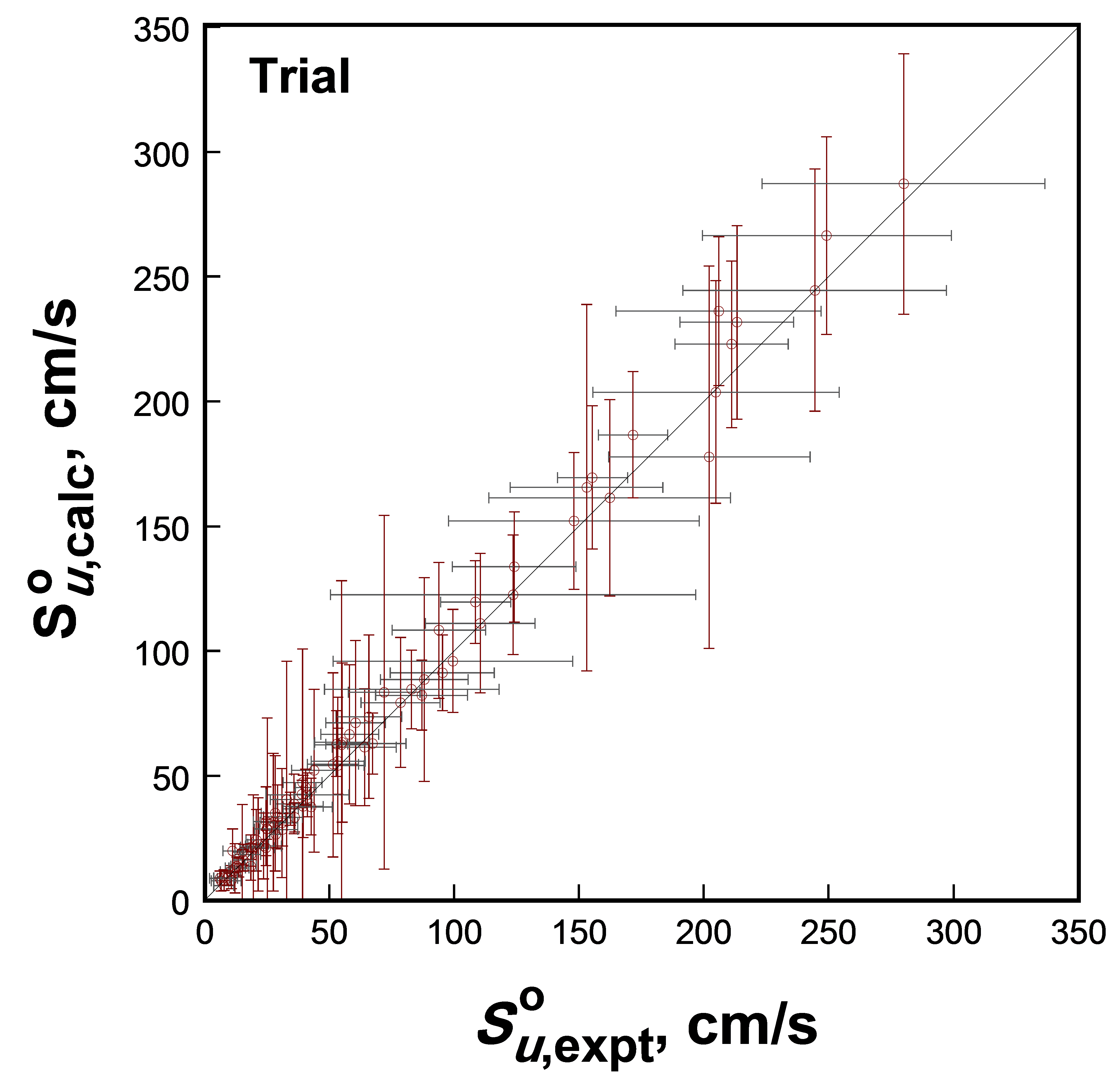 Figure 1. Comparison of the nominal flame-speed predictions and their uncertainties against experimental data. Left panel: the trial model, right panel: the optimized model (FFCM-1).