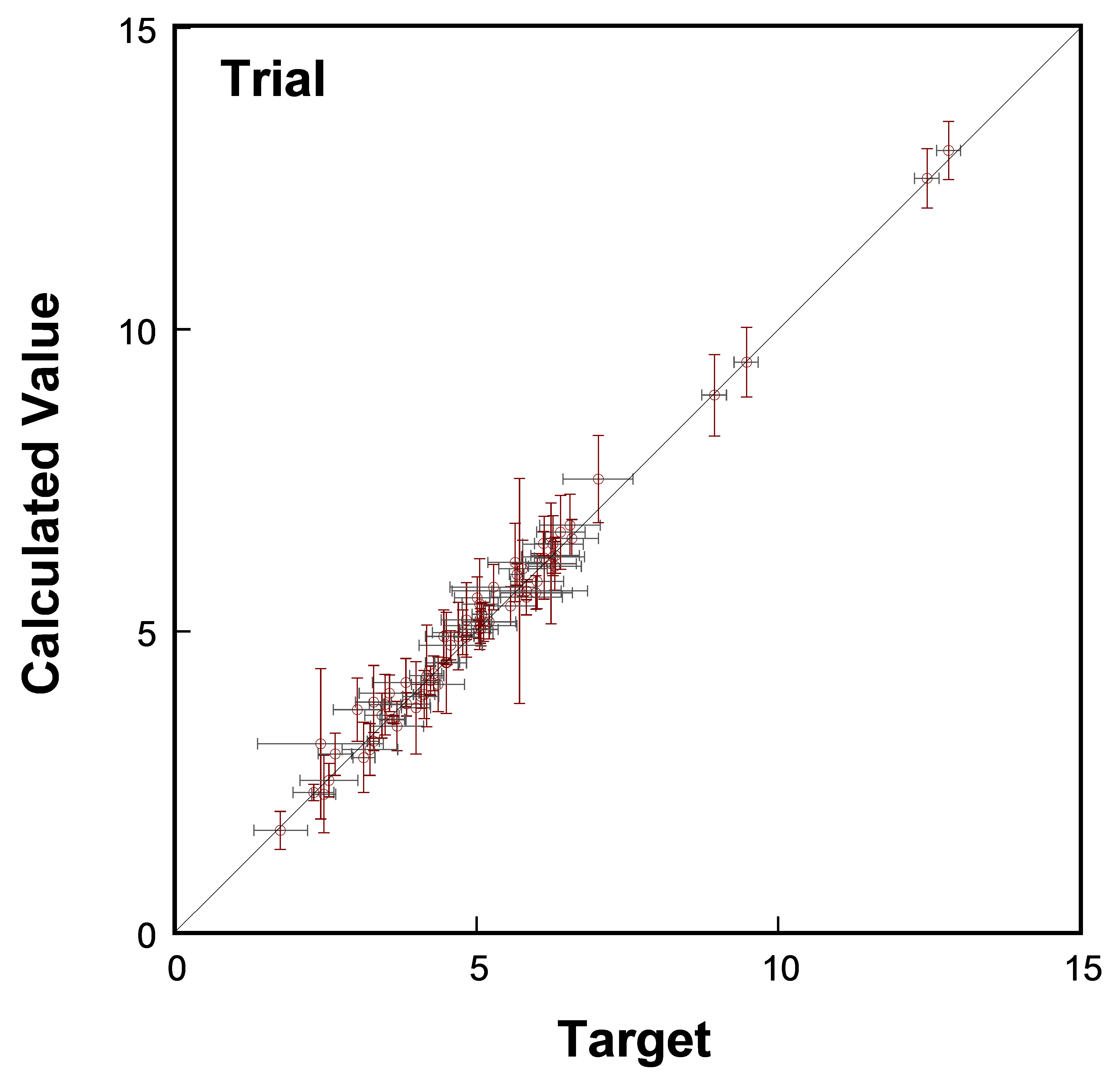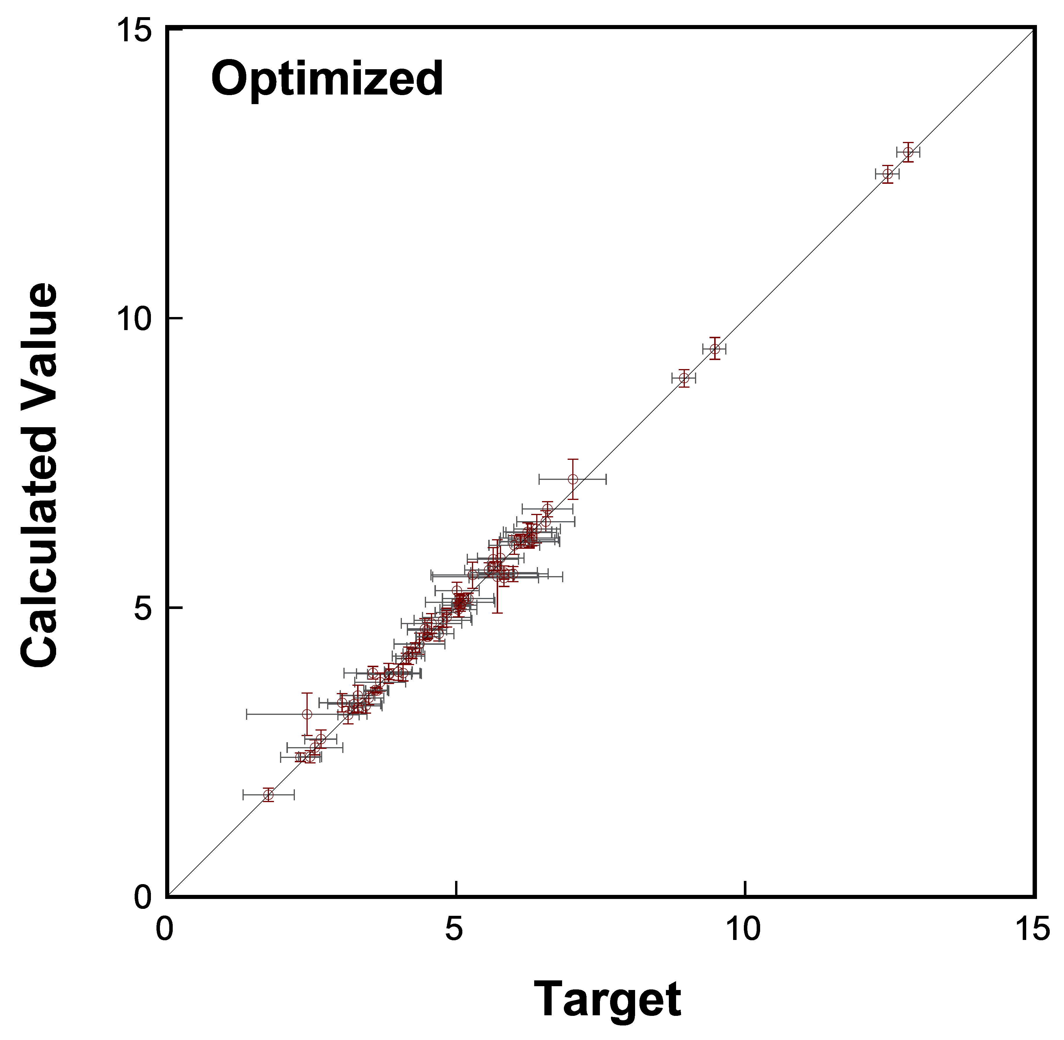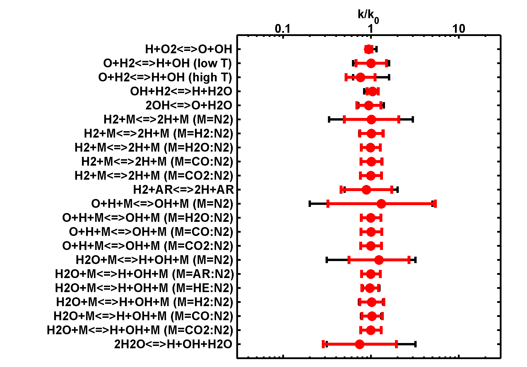 Figure 1 shows the model prediction against the flame speed target set for both trial and optimized models. The error bars represent 2-standard deviation. The optimized model shows improved agreement with the experimental data, and gives substantially reduced prediction uncertainty in all cases. For example, the trial model predicts the laminar flame speed targets with an average deviation of 11.5%, while the optimized model brings the deviation down to 6.7%. What is perhaps more significant is the greatly reduced model prediction uncertainty, as evidenced by the greatly reduced 2σ values of the optimized model. Before optimization, the model prediction uncertainty is comparable to the experiment, whereas after optimization the 2σ values of the model are reduced by a factor ranging from 2 to 15. A similar test for the shock-tube and flow reactor targets is shown in Figure 2. Again, the optimization procedure greatly reduced the model prediction uncertainty.