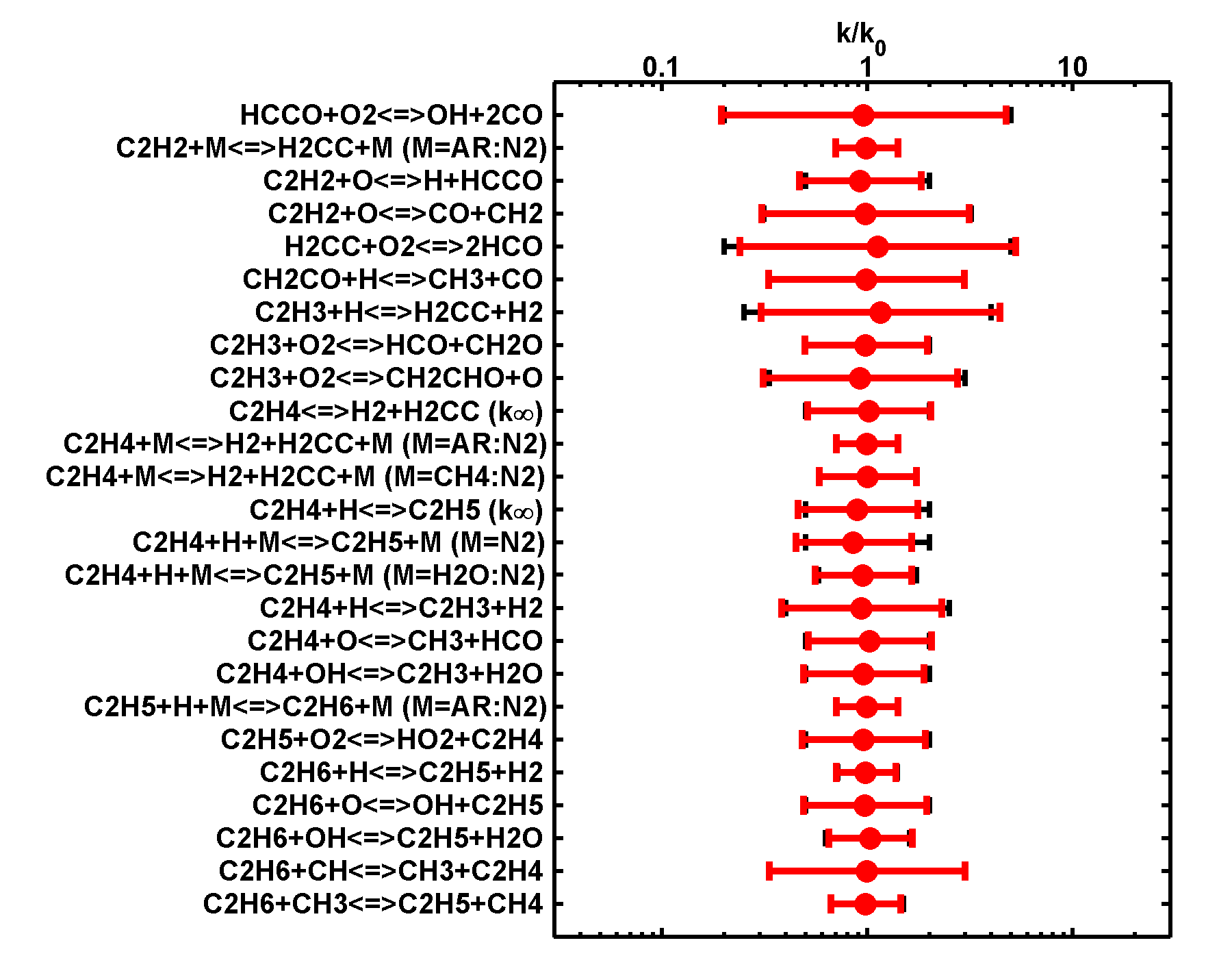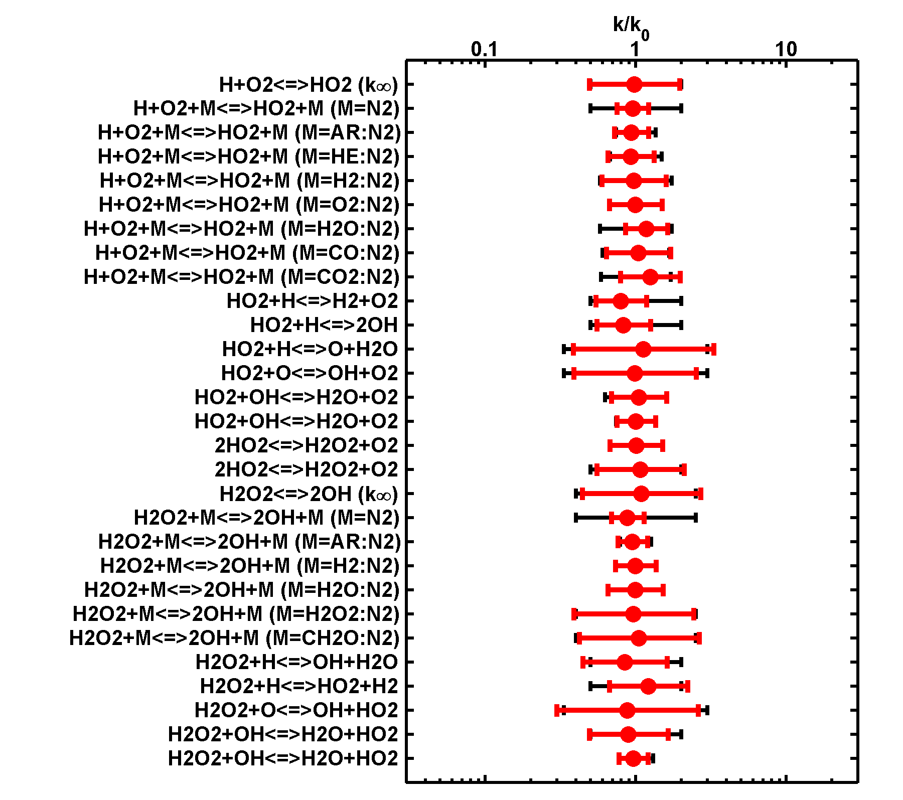 The ±2σ spans of reaction rate coefficients before and after the model optimization and uncertainty minimization procedure are shown in Figures 3a-f. In general, the optimized rate parameters are well within their original uncertainty bounds and have somewhat reduced overall uncertainties than the original uncertainty range. Reduction of the model prediction uncertainty is achieved largely through the covariance matrix (Figure 4 and 5), where the outermost ellipses span ±2σ in each dimension.