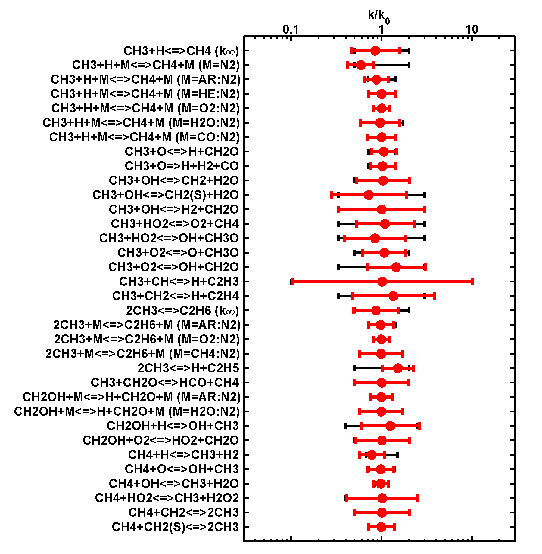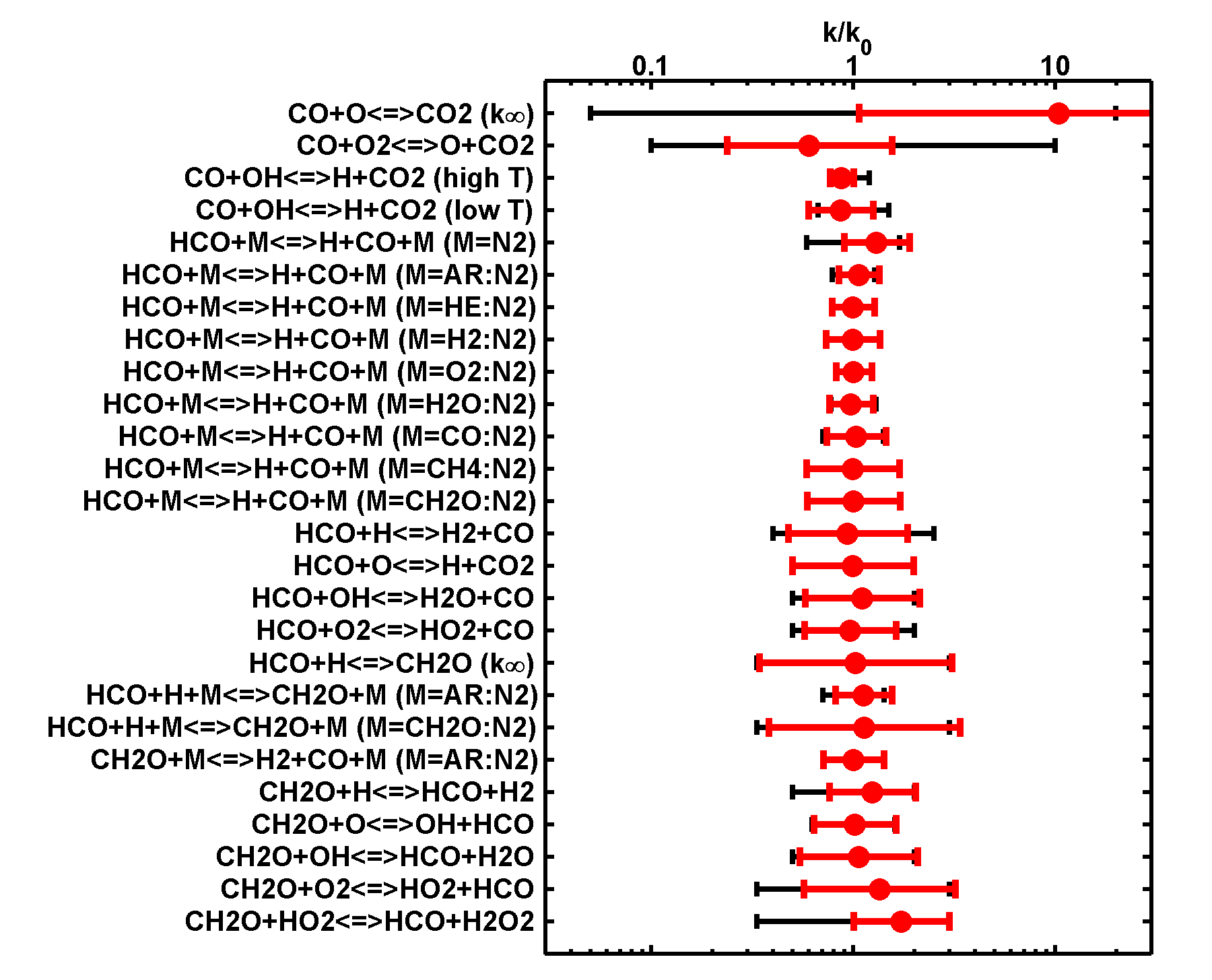 Figure 3c. Comparisons of upper and lower bounds of the rate parameters before (black) and after (red) rate parameter optimization and uncertainty minimization - the CO, HCO and CH2O subset.