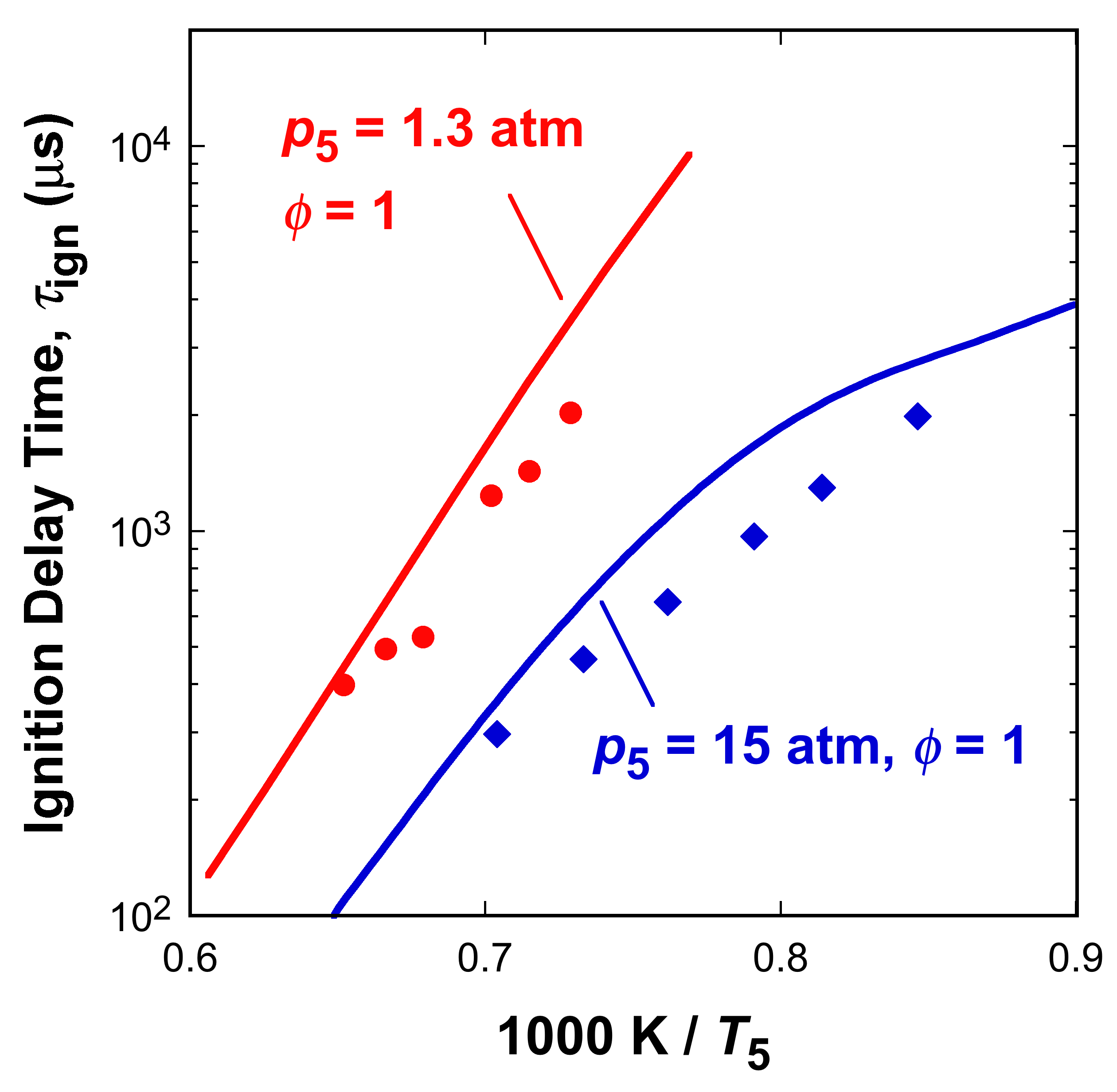 Fig. 1. Experimental (symbols) and simulated (lines) shock tube ignition delay of C1 in air. Data are taken from [1].