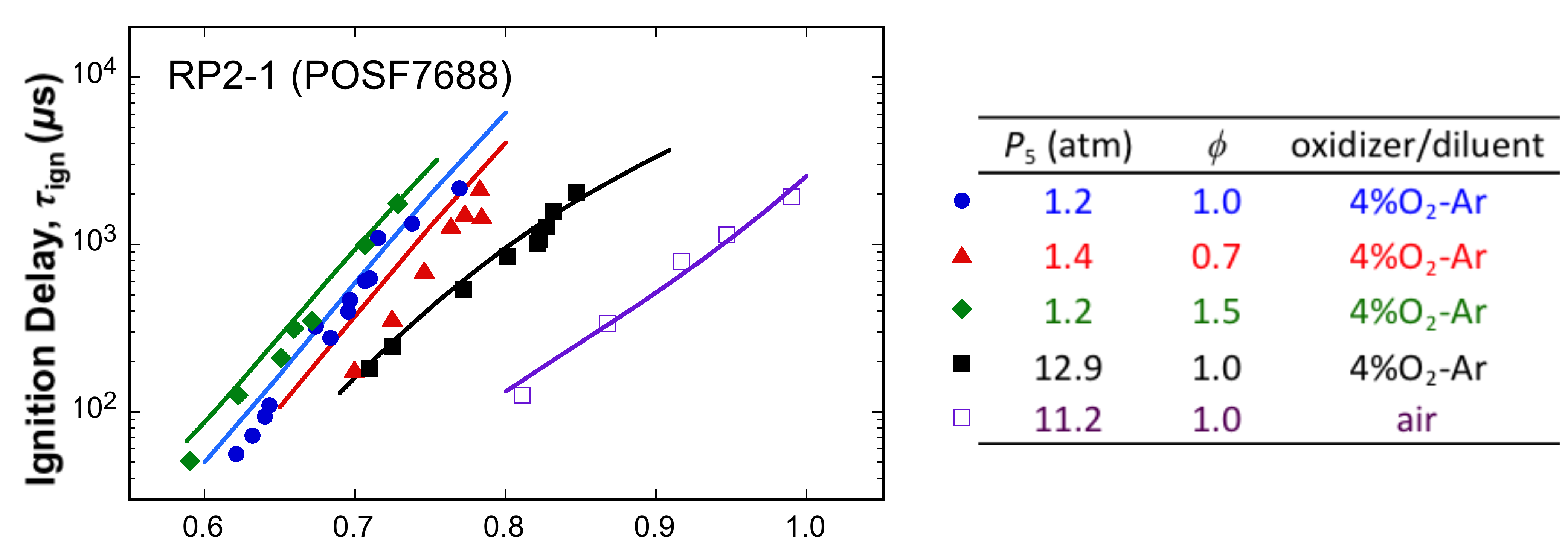 Fig. 1. Measured (symbols) and simulated (solid lines) ignition delay times of RP2-1 (POSF7688) under various mixture conditions.Data are taken from [1] and [2].