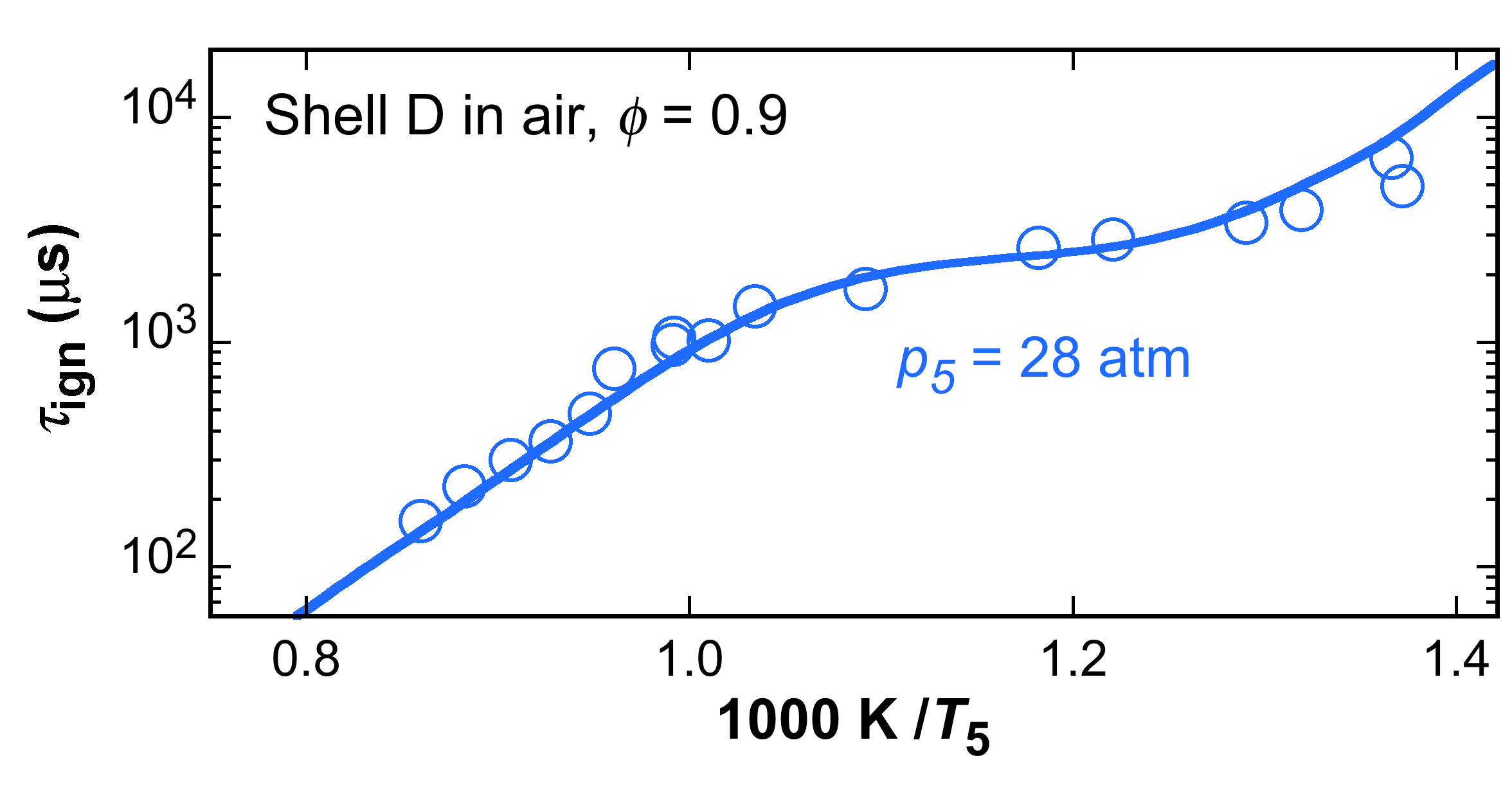 Fig. 1. Measured (symbols) and simulated (lines) ignition delay times of Shell D in air. Experimental data are taken from [1].