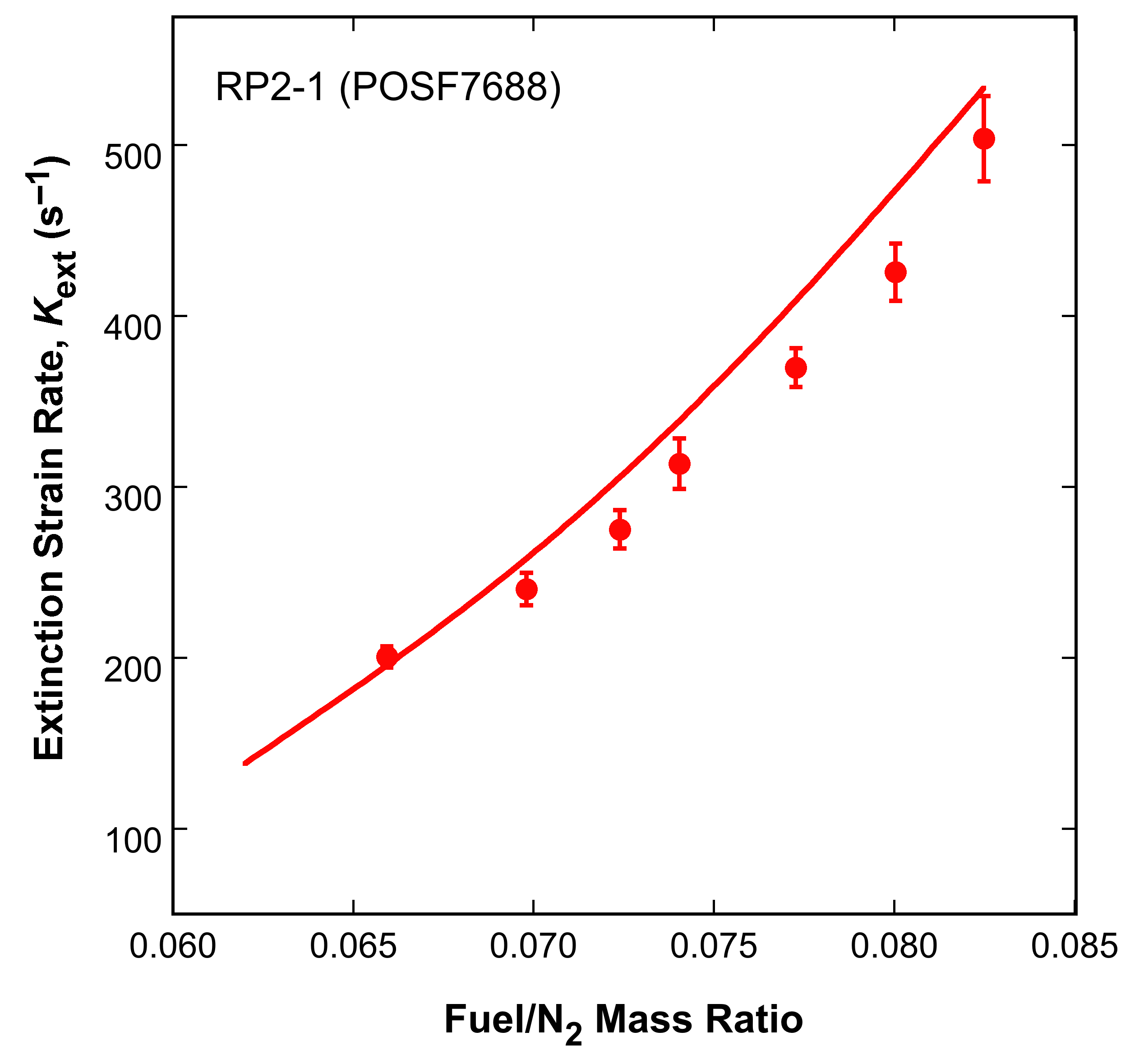 Fig. 1. Experimental (symbols) and simulated (lines) extinction strain rate of non-premixed RP2-1/N2 against O2 with the RP2-1/N2 jet temperature at 473 K and O2 temperature at 300 K (right panel). The error bars represent ±2σ data uncertainties. Data are taken from [1].