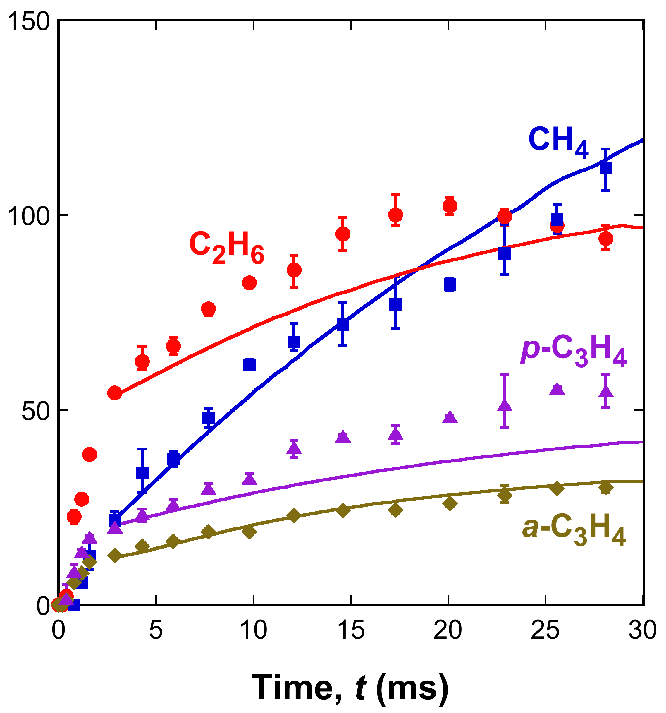 Fig. 1. Time histories of major oxidative pyrolysis species during the early stage of C1 oxidation (305 ppm C1 in a vitiated oxygen-nitrogen mixture at unity equivalence ratio) in a flow reactor at 1030 K temperature and 1 atm pressure. Symbols are experimental data; lines are simulations starting at 2.87 ms using measured species concentration as input of the initial condition. The concentrations of these species, including those from the vitiated mixture, are given in Table S3 of Ref. [1].