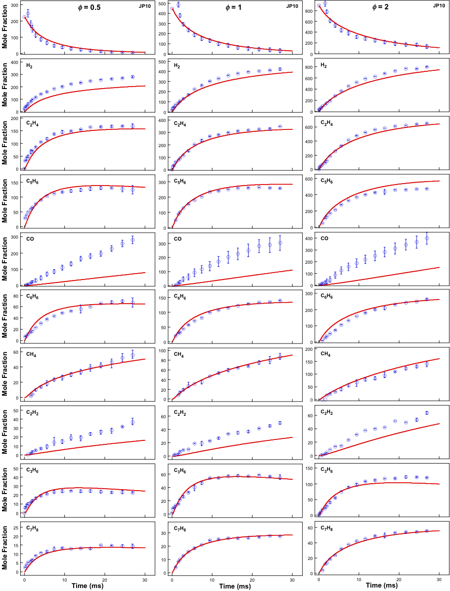 Fig. 1. Time histories of major oxidative pyrolysis species of JP-10 in a flow reactor at 1137 K temperature and 1 atm pressure. Symbols are experimental data; lines are simulations. Fuel loadings are 225 ppm (left panel), 450 ppm (middle panel), and 900 ppm (right panel). Data are taken from [1].