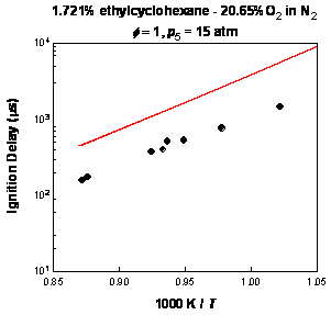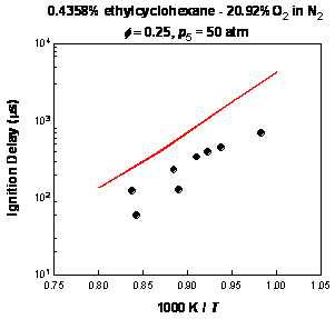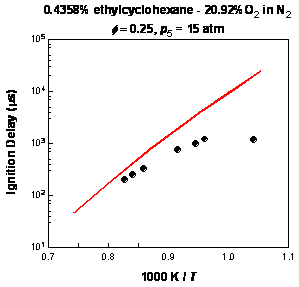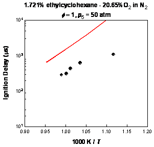 Ethylcyclohexane-Air Mixtures at Elevated Pressures,” International Journal of Chemical Kinetics 41 (2009) 82-91. Onset of OH emission. Lines: JetSurF v1.1 predictions |