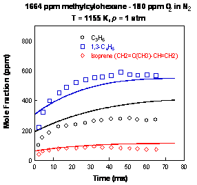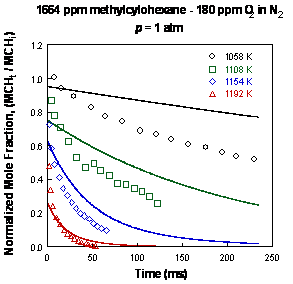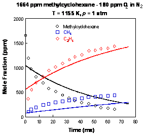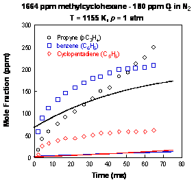 Symbols: Data S. Zeppieri, K. Brezinsky, I. Glassman, “Pyrolysis Studies of Methylcyclohexane and Oxidation Studies of Methylcyclohexane and Methylcyclohexane/Toluene Blends,” Combustion and Flame 108 (1997) 266-286.