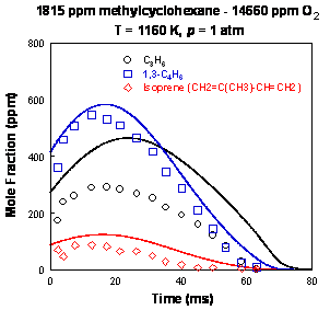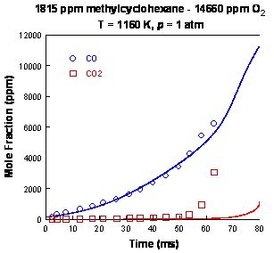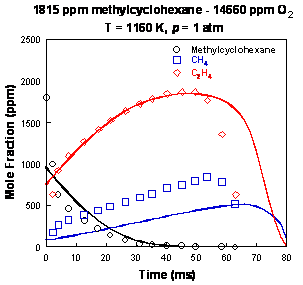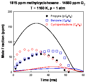 Symbols: Data S. Zeppieri, K. Brezinsky, I. Glassman, “Pyrolysis Studies of Methylcyclohexane and Oxidation Studies of Methylcyclohexane and Methylcyclohexane/Toluene Blends,” Combustion and Flame 108 (1997) 266-286.