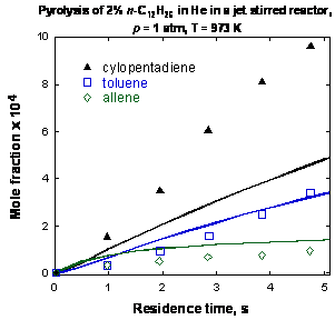 J. Anal. Appl. Pyrolysis 78 (2007) 419-429. Lines: JetSurF v0.2 predictions.