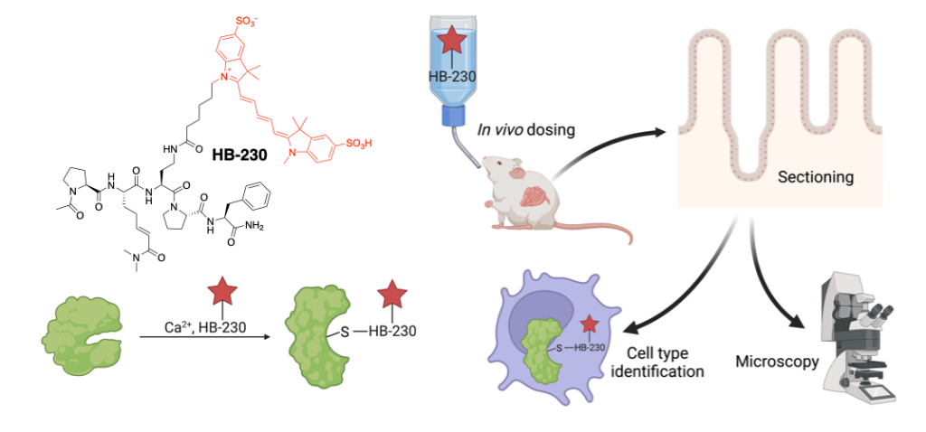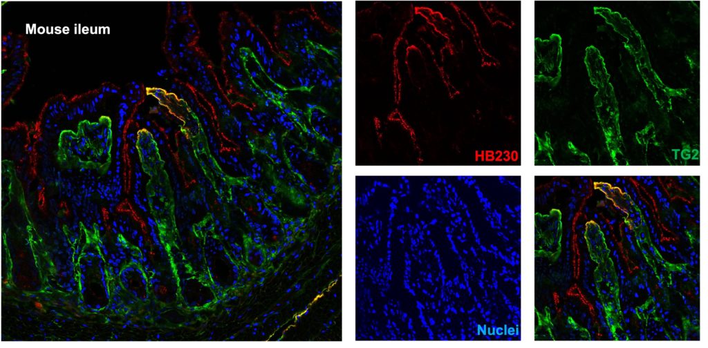 Using a fluorescent-tagged chemical probe (HB-230) to track active TG2 distribution in the mouse small intestine in vivo. Here we identified HB-230 in the lamina propria of mouse ileum, which is colocalized with TG2, demonstrating that TG2/gluten complex uptake and presentation by immune cells activate T cells in the small intestine.