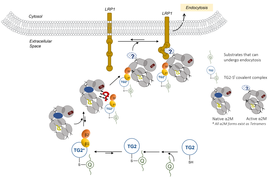 LRP1 endocytosis of TG2-Gluten Complex needs β-Barrel Recognition by α2-Macroglobulin. To further characterize the interactions in this pathway, we are have adopted structural (X-Ray Crystallography, SEC-SAXS) and biochemical analysis that measures binding of this four-component system. When combined, these studies may give insight into the selective endocytosis via the LRP1 Pathway.