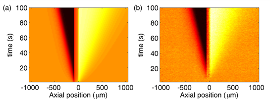 Figure 3. Spatiotemporal plots showing (a) simulation result (b) experimental result for 1 mM Alexa Fluor 488 in a 1 mm deep microchannel, 50 nm deep nanochannel system. The nanochannel is 100 mm long, and is visible as a grey region at the center of the image. White indicates high concentration. Black indicates low concentration. These results are for a constant current of 200 pA.