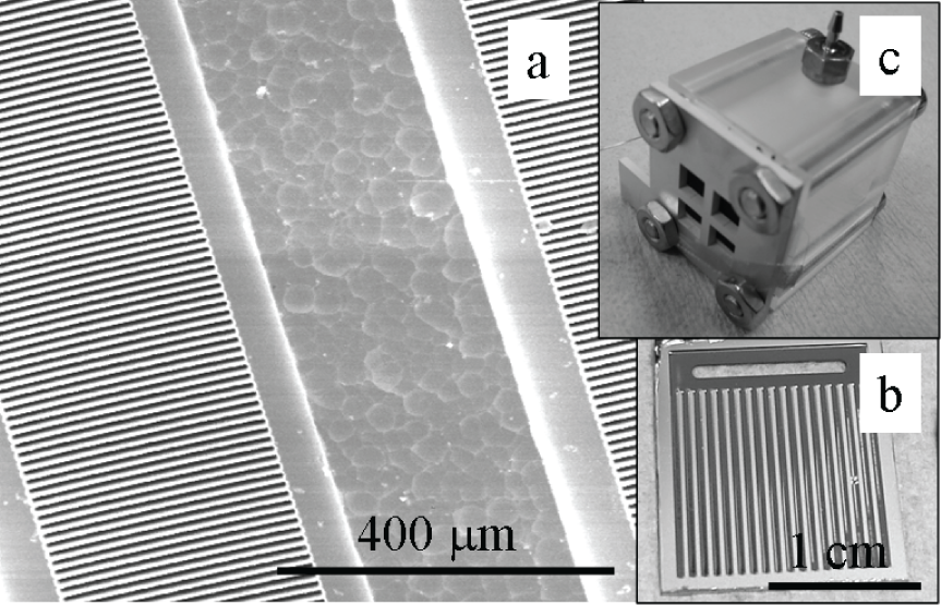 Figure 1. SEM (a), digital image (b) of the top view of our integrated EO pump/DMFC anode structure, and the full DMFC assembly (c). The SEM image is a top view into the flow channels showing the 5 mm wide EO pump slots etched into the bottom of the 400 mm wide anode flow channels. The pump slots deliver methanol perpendicular to the plane, out of the page, and into the anode channels. The anode channels (b) allow methanol to flow through the plane and react along the membrane electrode assembly (MEA). |