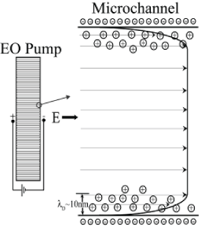 Figure 2. Schematic of porous Si medium modeled as many microchannels in parallel. A single channel of the porous material is shown on the right. An electrical double layer (EDL) spontaneously forms on glass/electrolyte interfaces. Bulk motion in the channel is generated by a coupling of the applied electric field E and the net mobile charge in the EDL. |