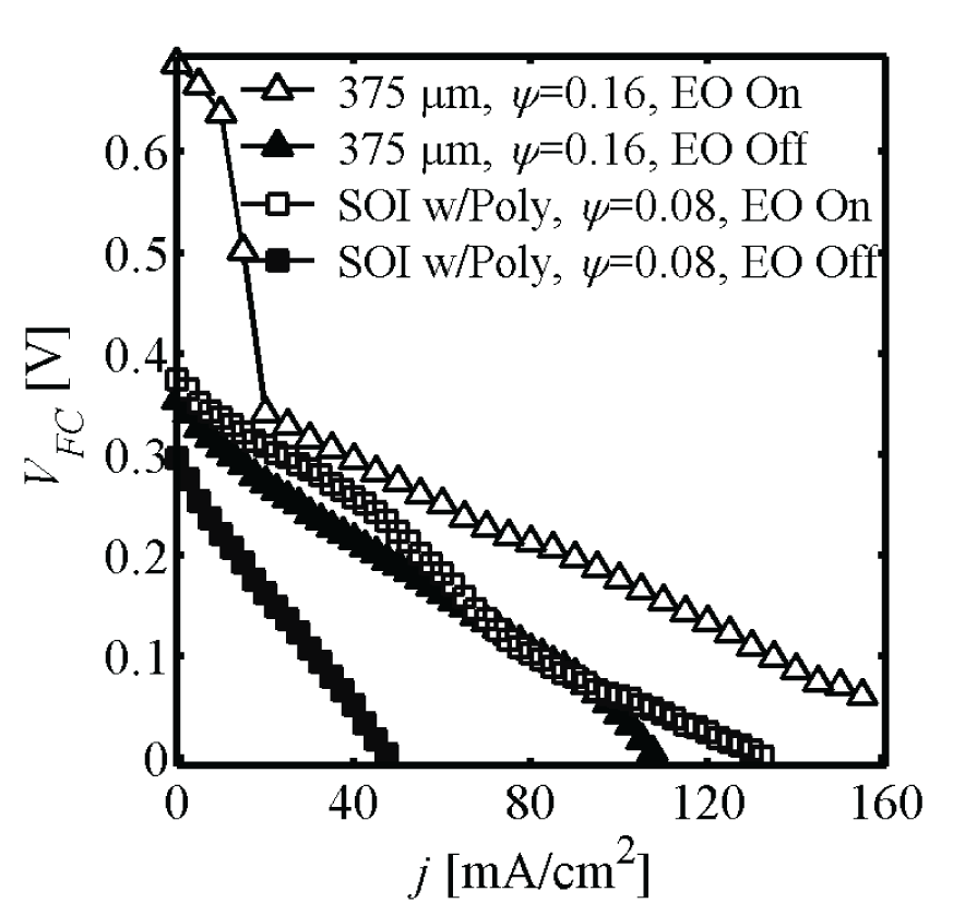 Polarization and power density data in Figure 3 show that activation of the EO pump significantly improves DMFC performance. In both cases, the EO pump activated tests (open symbols) result in higher power densities than the inactive EO pump (closed symbol) tests. The maximum measured power density, 17.8 mW/cm2, is comparable to the 16 mW/cm2 reported by Lu et al.2 for a DMFC of similar size at room temperature.