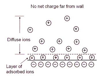 Electrokinesis involves the interaction of solid surfaces, ionic solutions, and electric fields. Electric fields can be used to generate bulk fluid motion (electroosmosis) and to separate charged species (electrophoresis). Electrophoresis is the simple drift of ions caused by an applied electric field. Electroosmosis describes the motion of electrolyte liquids with respect to a fixed wall that results when an electric field is applied parallel to the surface. Electrokinetic flows are in general a subclass of electrohydrodynamic (EHD) flows, and are distinguishable in that they involve liquid electrolyte solutions and the presence of electrical double layers. Below is a schematic of an electric double layer.
