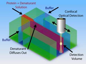 denaturant diffuses out of the focused stream inducing the proteins to
