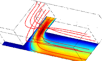 Figure 2. Simulations of flow field in mixer including velocity field and convective diffusion of denaturant molecules from the center stream to the outer, sheath streams (on the left). These simulations have been validated using micro-PIV experiments (Hertzog, 2004). On the right is an oblique view of streamlines at relatively high Reynolds numbers (Re = 30), where flow becomes strongly three-dimensional and centripetal flow effects lead to dispersion and harder-to-control mixing.