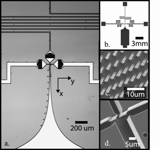 Figure 1. Schematic of mixer and SEM of silicon device. A)