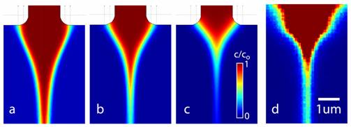 subsequent mixing rate) of protein denaturant from center stream (a-c). Model shows that the thinnest stream