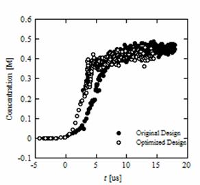iodide versus time for our original mixer design and a shape-optimized