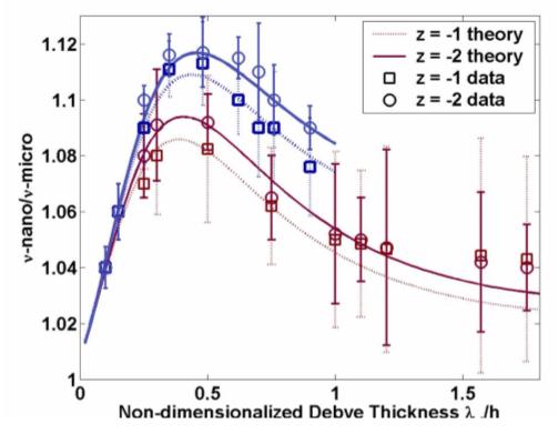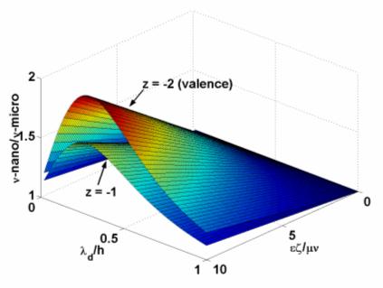 Our results suggest new techniques for increased separation resolution of ionic species. We have proposed a method we term “Electrokinetic Separation by Ion Valence (EKSIV)” whereby both ion valence and bulk mobility may be determined independently from a comparison of micro- and nano-scale channel electrophoresis measurements. The dependence of effective nanochannel mobility on valence (and its deviation from bulk mobility) is summarized in the figure below for two valence values.