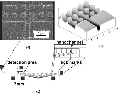 Figure 2. Scanning electron micrograph (SEM) (a) and atomic force microscopy (AFM) scan (b) of the inlet region of a 102 nm deep fluidic channel. The images show 1 mm diameter posts near the inlet of the nanochannel which serve as an integrated filtering structure. (c) Schematic of nanochannel device with 125 mm by 75 mm detection area centered 7 mm from the injection point. Etched tick marks aid in registration and quantitation.