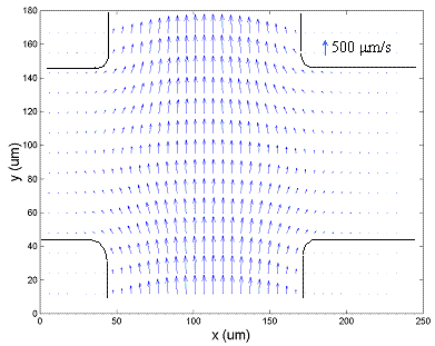 Figure 1. mPIV measurements for pressure-driven flow through an intersection of 120 (wide) by 50 (depth) micron deep channels (a). (b) and (c) show comparisons of mPIV (and particle tracking velocimetry) measurements with flow predictions. Latter plots show streamwise velocity against transverse x-distance and streamwise velocity versus streamwise y-distance. |