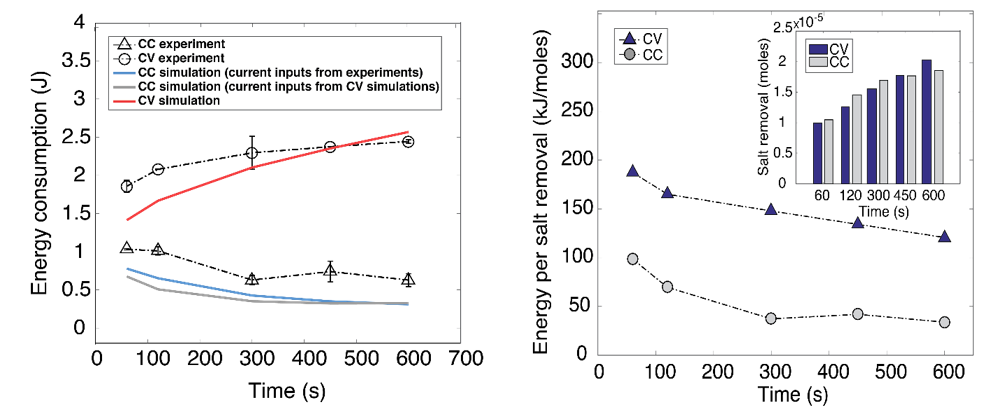 We have used models and experiments with ftCDI cells to demonstrate that charging under constant current conditions is more energy efficient than constant voltage charging (for CDI in general). We performed a fair comparison wherein an identical cell was charged for the same time and resulting in the same amount of charge. Figure 2 below summarizes our findings (from Qu et al., 2016).
