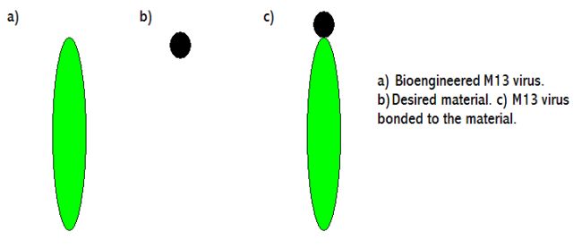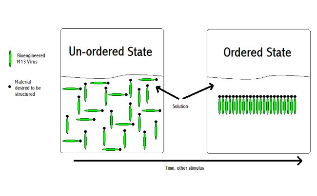 The virus most commonly used in this process is a genetically-engineered form of the M13 virus,[3] a virus safe for both humans and the environment.[4] Through genetic-engineering, the adapted M13 virus is capable of bonding itself to the individual atoms or molecules of nearly any substance desired (Fig. 1).[3] Once the virus has bonded with these atoms, it aligns within a solution with other M13 viruses that are also bonded to the same material.[3] What results from this process is a high-ordered structure consisting of the material the virus was bonded with- in essence, a self-assembled nanostructure (Fig. 2).[3]