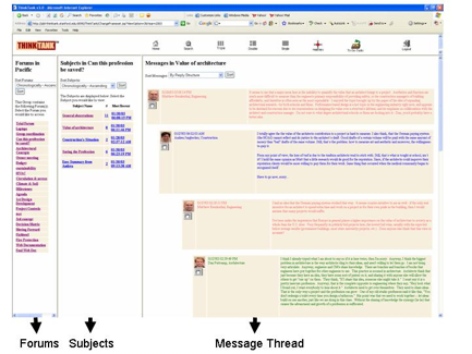 ThinkTank is a discussion forum environment we developed to effectively support project specific asynchronous communication and collaboration activities in distributed teams. ThinkTank functionalities evolved based on ethnographic studies of the state-of-practice in industry and academia focused on the cross-disciplinary project team communication needs. It provides many of the advantages of face-to-face team meetings combined with the utility of e-mail and the organization of database technology. ThinkTank facilitates A/E/C project team members to create, capture, archive, share, email, reply, attach additional documents, track, sort, search, and re-use data, information, and knowledge. The underlying Microsoft Access® or Oracle® database is organized by groups, with each group having a private, password-protected, virtual asynchronous meeting room. Within the group meeting rooms the content is organized based on the ?book? metaphor with three levels of organization: Forums representing key topics or project phases for similar to book chapters, Subjects representing issues brought up within a Forum, similar to section within a chapter of a book, and threaded Messages representing the actual ideas captured and shared among team members, similar to the paragraphs within a section of a book.