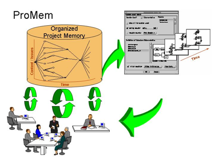 The ProMem (Project Memory) system takes the semantic modeling engine (SME) as its point of departure and adds to it the time dimension. ProMem captures the evolution of the project at the three levels of granularity identified by the semantic modeling engine (SME) that emulates the structure of project knowledge: project, discipline, and component. ProMem automatically versions each SME object every time a change is made in the design or additional knowledge is created and linked to an object. This versioning is transparent to the designer. The designer is able to go back and flag any version to indicate its level of importance (low, conflict, or milestone) and its level of sharing (private, public, or consensus).