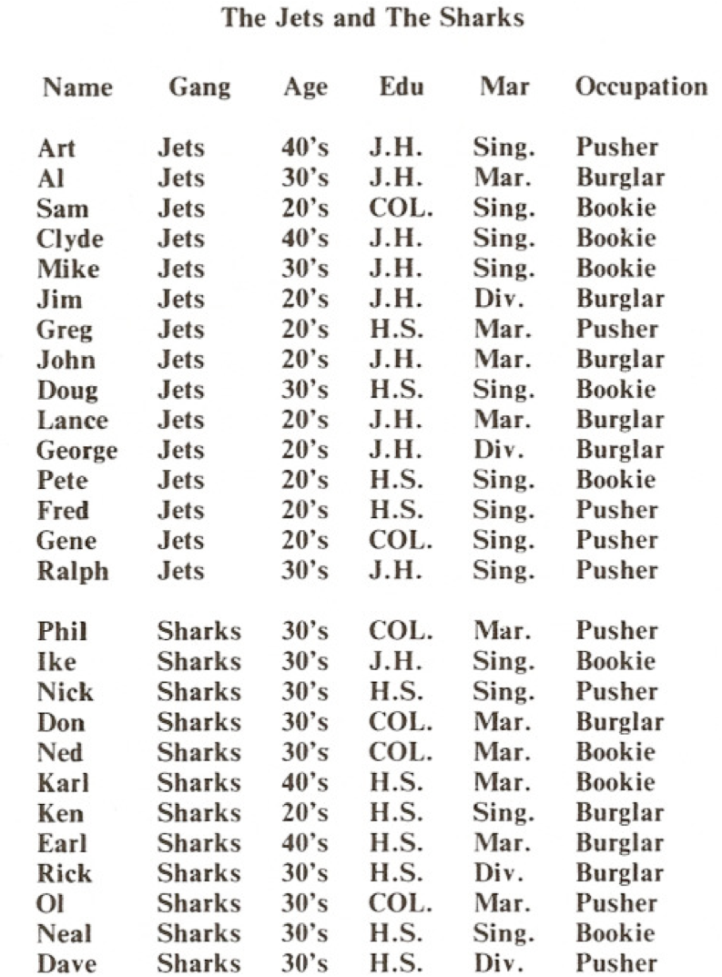 The “data base” for this exercise is the Jets and Sharks data base shown in Figure 10 of PDP:1 and reprinted here for convenience in Figure 2.1. You are to use the iac program in conjunction with this data base to run illustrative simulations of these basic properties of memory. In so doing, you will observe behaviors of the network that you will have to explain using the analysis of IAC networks presented earlier in the “Background section”.