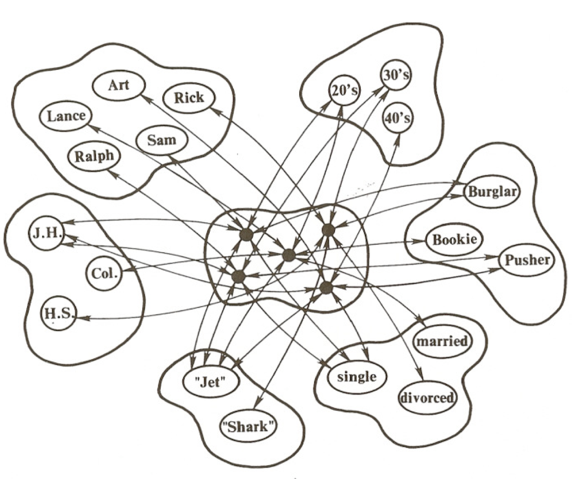 Spontaneous generalization. Now we consider the network’s ability to retrieve appropriate generalizations over sets of individuals—that is, its ability to answer questions like “What are Jets like?” or “What are people who are in their 20s and have only a junior high education like?” Click the ‘reset’ button in the network window. Make sure all units have input of 0. Be sure to reinstall the connections between 13-Burglar and 10_Lance (set them back to 1). You can exit and restart the network if you like, or you can use the up arrow key to retrieve the last two commands above and edit them, replacing 0 with 1, as in: