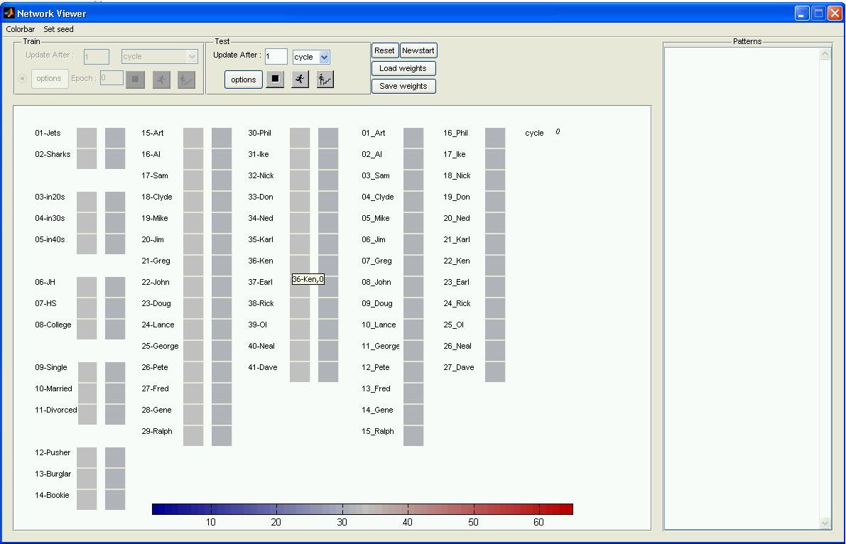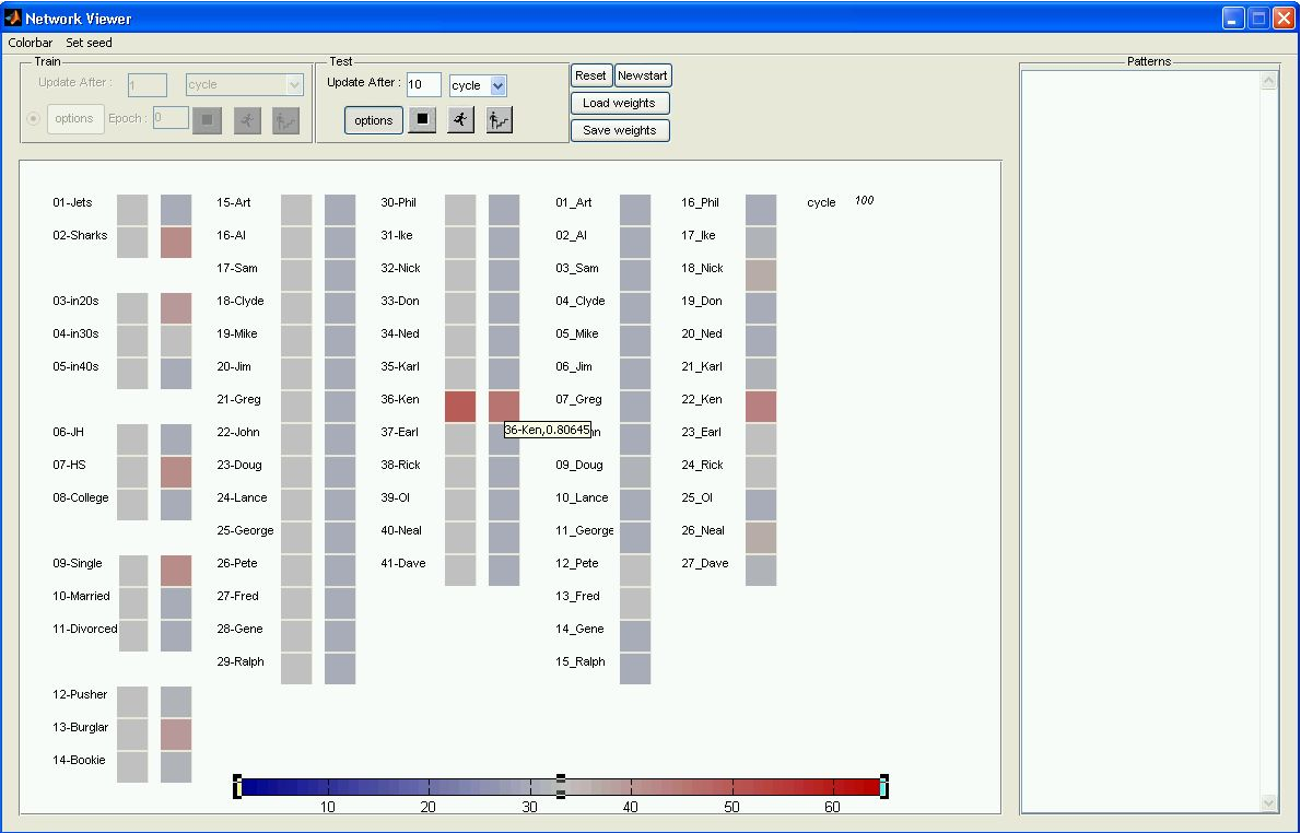 If the colorbar is not on, click the ‘colorbar’ menu at the top left of the display. Select ‘on’. To select the correct ‘colorbar’ for the jets and sharks exercise, click the colorbar menu item again, click ‘load colormap’ and then select the jmap colormap file in the iac directory. With this colormap, an activation of 0 looks gray, -.2 looks blue, and 1.0 looks red. Note that when you hold the mouse over a colored tile, you will see the numeric value indicated by the color (and you get the name of the unit, as well). Try right-clicking on the colorbar itself and choosing other mappings from ‘Standard Colormaps’ to see if you prefer them over the default.
