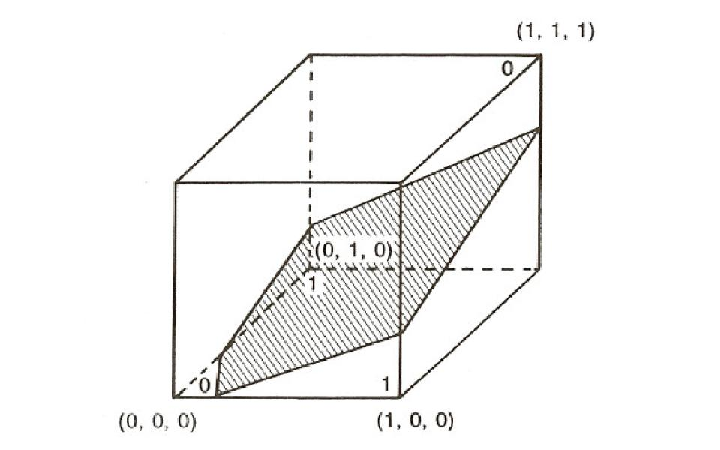 Obviously, we can’t have both w1 and w2 greater than θ while their sum, w1 + w2, is less than θ. There is a simple geometric interpretation of the class of problems that can be solved by a perceptron: It is the class of linearly separable functions. This can easily be illustrated for two dimensional problems such as XOR. Figure 5.3 shows a simple network with two inputs and a single output and illustrates three two-dimensional functions: the AND, the OR, and the XOR. The first two can be computed by the network; the third cannot. In these geometrical representations, the input patterns are represented as coordinates in space. In the case of a binary two-dimensional problem like XOR, these coordinates constitute the vertices of a square. The pattern 00 is represented at the lower left of the square, the pattern 10 as the lower right, and so on. The function to be computed is then represented by labeling each vertex with a 1 or 0 depending on which class the corresponding input pattern belongs to. The perceptron can solve any function in which a single line can be drawn through the space such that all of those labeled ”0” are on one side of the line and those labeled ”1” are on the other side. This can easily be done for AND and OR, but not for XOR. The line corresponds to the equation i1w1 + i2w2 = θ. In three dimensions there is a plane, i1w1 + i2w2 + i3w3 = θ, that corresponds to the line. In higher dimensions there is a corresponding hyperplane, ∑ iwiii = θ. All functions for which there exists such a plane are called linearly separable.