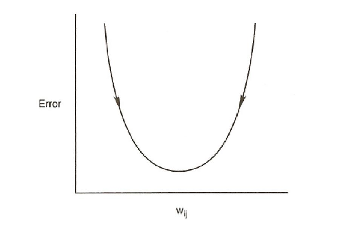 where the index p ranges over the set of input patterns, i ranges over the set of output units, and Ep represents the error on pattern p. The variable tip is the desired output, or target, for the ith output unit when the pth pattern has been presented, and oip is the actual output of the ith output unit when pattern p has been presented. The object is to find a set of weights that minimizes this function. It is useful to consider how the error varies as a function of any given weight in the system. Figure 5.7 illustrates the nature of this dependence. In the case of the simple single-layered linear system, we always get a smooth error function such as the one shown in the figure. The LMS procedure finds the values of all of the weights that minimize this function using a method called gradient descent. That is, after each pattern has been presented, the error on that pattern is computed and each weight is moved ”down” the error gradient toward its minimum value for that pattern. Since we cannot map out the entire error function on each pattern presentation, we must find a simple procedure for determining, for each weight, how much to increase or decrease each weight. The idea of gradient descent is to make a change in the weight proportional to the negative of the derivative of the error, as measured on the current pattern, with respect to each weight.1 Thus the learning rule becomes