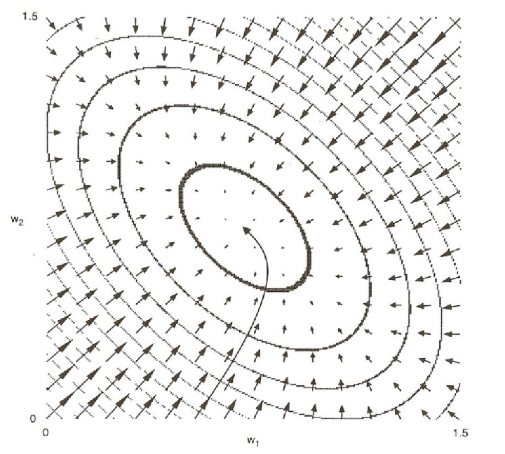 In order to get a fuller understanding of this process it is useful to carefully consider the entire error space rather than a one-dimensional slice. In general this is very difficult to do because of the difficulty of depicting and visualizing high-dimensional spaces. However, we can usefully go from one to two dimensions by considering a network with exactly two weights. Consider, as an example, a linear network with two input units and one output unit with the task of finding a set of weights that comes as close as possible to performing the function OR. Assume the network has just two weights and no bias terms like the network in Figure 5.3A. We can then give some idea of the shape of the space by making a contour map of the error surface. Figure 5.8 shows the contour map. In this case the space is shaped like a kind of oblong bowl. It is relatively flat on the bottom and rises sharply on the sides. Each equal error contour is elliptically shaped. The arrows around the ellipses represent the derivatives of the two weights at those points and thus represent the directions and magnitudes of weight changes at each point on the error surface. The changes are relatively large where the sides of the bowl are relatively steep and become smaller and smaller as we move into the central minimum. The long, curved arrow represents a typical trajectory in weight-space from a starting point far from the minimum down to the actual minimum in the space. The weights trace a curved trajectory following the arrows and crossing the contour lines at right angles.