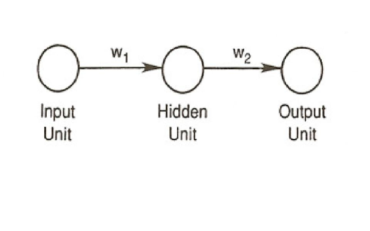 Now let us consider a weight that projects from an input unit k to a hidden unit j, which in turn projects to an output unit, i in a very simple network consisting of only one unit at each of these three layers (see Figure 5.9). We can ask, what is the partial derivative of the error on the output unit i with respect to a change in the weight wjk to the hidden unit from the input unit? It may be helpful to talk yourself informally through the series of effects changing such a weight would have on the error in this case. It should be obvious that if you increase the weight to the hidden unit from the input unit, that will increase the net input to the hidden unit j by an amount that depends on the activation of the input unit k. If the input unit were inactive, the change in the weight would have no effect; the stronger the activation of the input unit, the stronger the effect of changing the weight on the net input to the hidden unit. This change, you should also see, will in turn increase the activation of the hidden unit; the amoung of the increase will depend on the slope (derivative) of the unit’s activation function evaluated at the current value of its net input. This change in the activation with then affect the net input to the output unit i by an amount depending on the current value of the weight to unit i from unit j. This change in the net input to unit i will then affect the activation of unit i by an amount proportional to the derivative of its activation function evaluated at the current value of its net input. This change in the activation of the output unit will then affect the error by an amount proportional to the difference between the target and the current activation of the output unit.