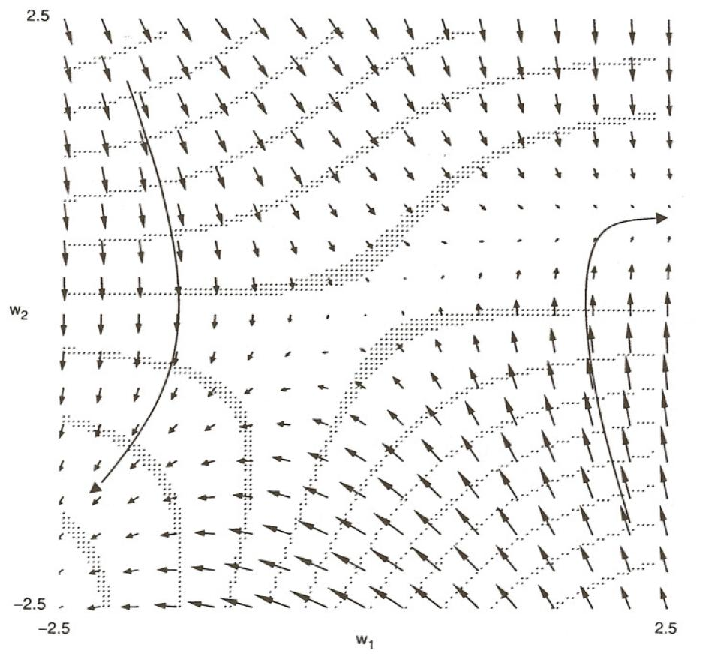 Usually, it is difficult to see why a network has been caught in a local minimum. However, in this very simple case, we have only two weights and can produce a contour map for the error space. The map is shown in Figure 5.12. It is perhaps difficult to visualize, but the map roughly shows a saddle shape. It is high on the upper left and lower right and slopes down toward the center. It then slopes off on each side toward the two minima. If the initial values of the weights begin one part of the space, the system will follow the contours down and to the left into the minimum in which both weights are negative. If, however, the system begins in another part of the space, the system will follow the slope into the upper right quadrant in which both weights are positive. Eventually, the system moves into a gently sloping valley in which the weight from the hidden unit to the output unit is almost constant at about 0.73 and the weight from the input unit to the hidden unit is slowly increasing. It is slowly being sucked into a local minimum. The directed arrows superimposed on the map illustrate thelines of force and illustrate these dynamics. The long arrows represent two trajectories through weightspace for two different starting points.